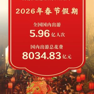 文化和旅游部2月24日公布2026年春节假期文化和旅游市场情况。春节假日9天,全国国内出游5.96亿人次,较2025年春节假日8天增加0.95亿人次;国内出游总花费8034.83亿…