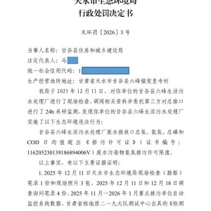 甘肃天水市生态环境局网站4月13日曝光一起行政处罚案件,因生活污水厂废水排放超标,甘谷县住房和城乡建设局被处以罚款363800元。 天环罚〔2026〕3号行政处罚决定书显示,天水市…