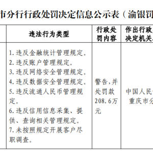 光大银行重庆7宗违法被罚208.6万 违反账户管理规定等