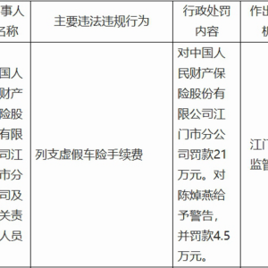 人保财险江门市分公司被罚 列支虚假车险手续费