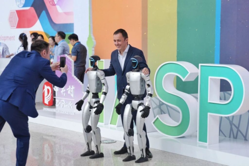 2025年9月17日,国际科技园及创新区域协会(IASP)2025年世界大会在北京国家会议中心开幕。图为外籍嘉宾在大会现场同机器人合影。中新社 记者 张祥毅 摄