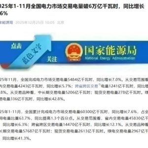 据国家能源局微信公众号消息,2025年11月,全国完成电力市场交易电量5484亿千瓦时,同比增长7.0%。从交易范围看,省内交易电量4243亿千瓦时,同比增长5.7%;跨省跨区交易…