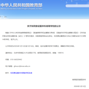 1月12日,教育部网站发布《关于拟同意设置本科高等学校的公示》。 根据《中华人民共和国高等教育法》《普通高等学校设置暂行条例》《普通本科学校设置暂行规定》《本科层次职业学校设置标准…