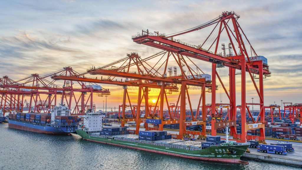 图为1月19日,轮船停泊在河北省唐山港京唐港区集装箱码头进行装卸作业(无人机照片)。新华社发(刘满仓 摄)