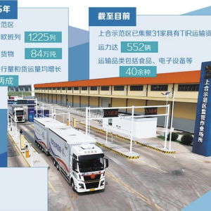 车辆从上合示范区国际道路运输集结中心驶出。赵天硕摄(中经视觉) 日前,两列中欧班列“日韩陆海快线”,从位于山东青岛的上合示范区多式联运中心发往哈萨克斯坦阿拉木图集结中心。而在上…