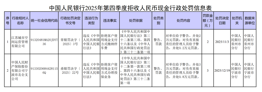 2025年第四季度,中国人民银行对2家核实为拒收人民币现金的单位及相关责任人依法作出经济处罚。广大经营主体应强化法治观念,尊重公众支付选择权,共同打造和谐现金流通环境。