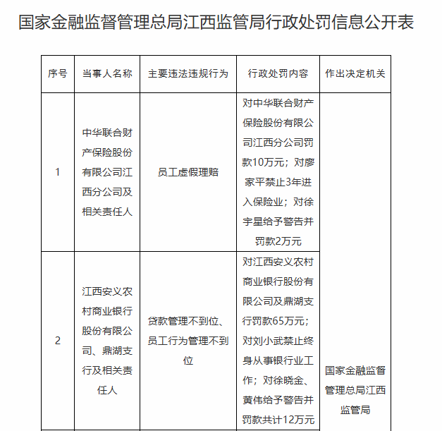 首页 大数据中心 中华联合财险江西分公司违规被罚 员工虚假理赔 中华联合财险江西分公司违规被罚 员工虚假理赔 大数据中心 总编辑 · 2026年1月26日 17:30 · 35428 阅读 · 0 评论 国家金融监督管理总局23日发布江西监管局行政处罚信息公开表。中华联合财产保险股份有限公司江西分公司及相关责任人存在以下违法违规事实:员工虚假理赔。 国家金融监督管理总局江西监管局决定对中华联合财产保险股份有限公司江西分公司罚款10万元;对廖家平禁止3年进入保险业;对徐宇星给予警告并罚款2万元。 来源:中国经济网 1 点赞 数据 图片转载于网络(如有侵权,请联系删除) 免责声明|内容转载于其他平台 不代表本平台观点立场 长期征集各类线索| 邮箱:wytglx@163.com