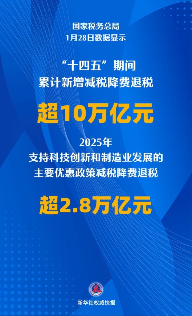 记者1月28日从全国税务工作会议上获悉,在经济增长等因素带动下,2025年,税务部门全年征收各项税费33.1万亿元,税费收入预算目标圆满完成。落实支持科技创新和制造业发展的主要优惠政策减税降费退税超2.8万亿元。“十四五”期间,税务部门累计征收税费超156万亿元,约占全口径财政收入的80%;累计新增减税降费退税超10万亿元,为经营主体发展壮大提供了有力支持。