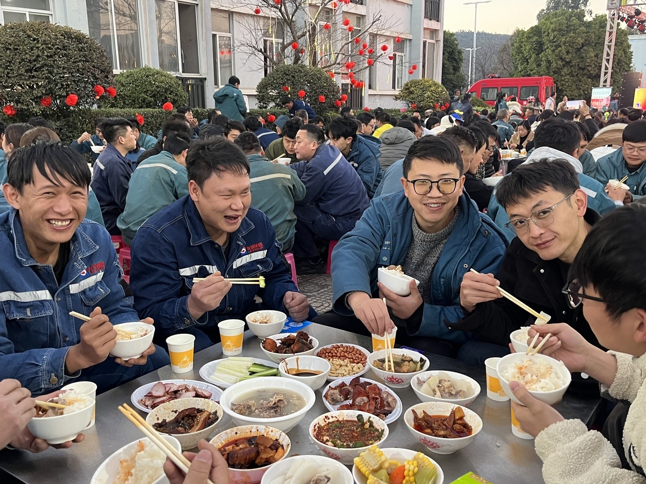 冬日的厂区因为这场“杀猪饭”盛宴的到来而变得暖意融融,220张餐桌整齐排开,2000余名职工及家属欢聚一堂。很多职工纷纷亮出拿手绝活,从选材到烹制,亲力亲为,力求还原最正宗的家乡味道。