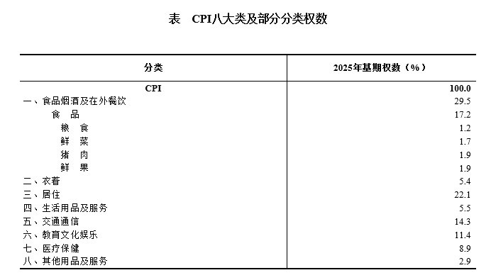 答:CPI权数是指按对比期价格购买“固定篮子”中各类商品或服务的支出占购买整个篮子所需支出的比重。权数来源以住户收支与生活状况调查中居民消费支出资料为主,部分小类和基本分类通过权数专项调查细化补充,并结合其他宏观数据、行业统计资料加以完善,确保权数客观真实反映居民消费结构。具体来看,食品烟酒及在外餐饮、衣着、居住、生活用品及服务、交通通信、教育文化娱乐、医疗保健、其他用品及服务八个大类的2025年基期权数分别为29.5%、5.4%、22.1%、5.5%、14.3%、11.4%、8.9%和2.9%。