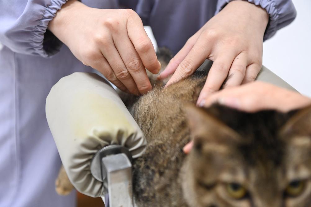 2026年2月1日,在广西南宁一家从事宠物寄养业务的宠物医院,工作人员为猫针灸。 新华社记者 曹祎铭 摄