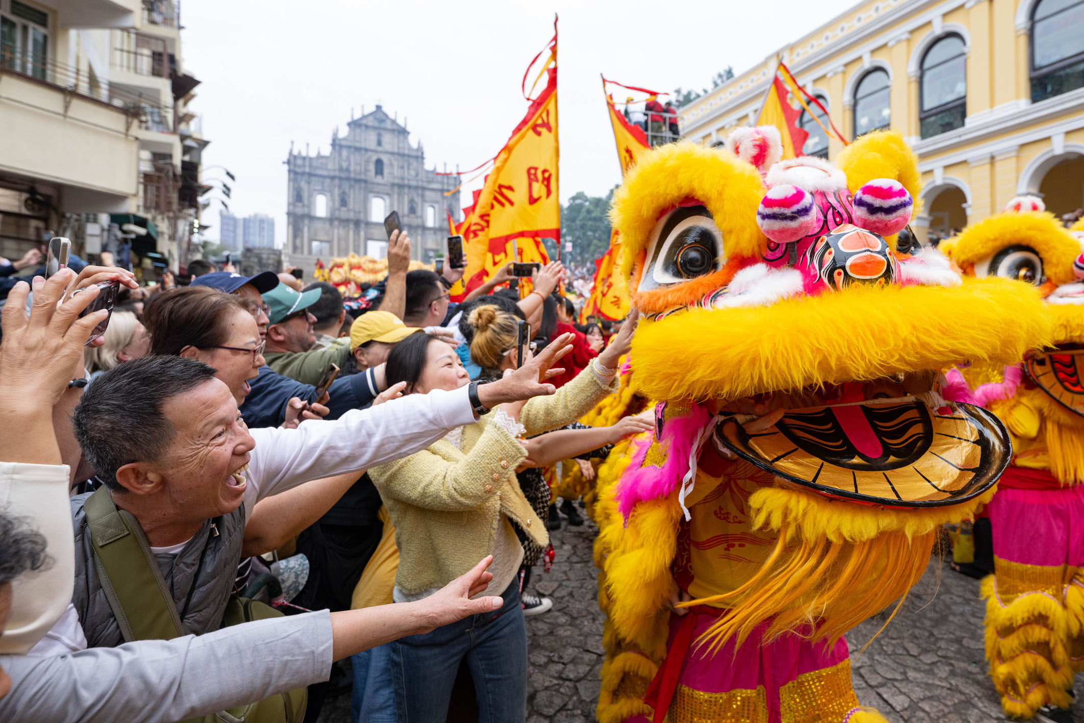 2月17日,舞狮队伍在澳门大三巴牌坊前与市民互动。新华社发(张金加 摄)