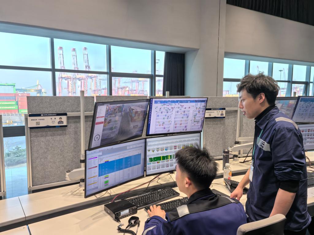 天津港第二集装箱码头有限公司信息部副经理班宏宇(右一)正在和调度员讨论堆场智能系统应用情况。新华社记者杨文 摄