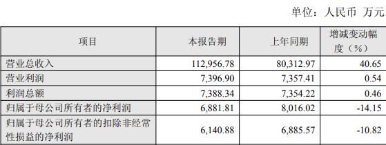 据公司2025年度业绩快报公告,报告期内,公司实现营业总收入112,956.78万元,同比增长40.65%;归属于母公司所有者的净利润6,881.81万元,同比下降14.15%;归属于母公司所有者的扣除非经常性损益的净利润6,140.88万元,同比下降10.82%。