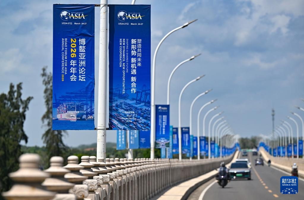 这是博鳌大乐大桥上的博鳌亚洲论坛2026年年会主题宣传牌(3月17日摄)。新华社记者 郭程 摄