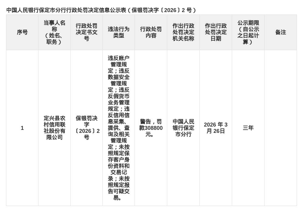 罚单显示,定兴县农村信用联社股份有限公司的主要违法违规行为是:违反账户管理规定;违反数据安全管理规定;违反反假货币业务管理规定;违反信用信息采集、提供、查询及相关管理规定;未按照规定保存客户身份资料和交易记录;未按照规定报告可疑交易。