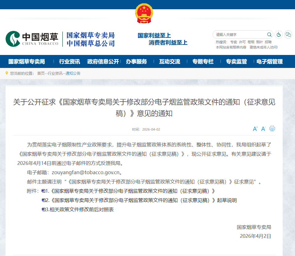 中国经济网北京4月2日讯 国家烟草专卖局今日发布关于公开征求《国家烟草专卖局关于修改部分电子烟监管政策文件的通知(征求意见稿)》意见的通知。