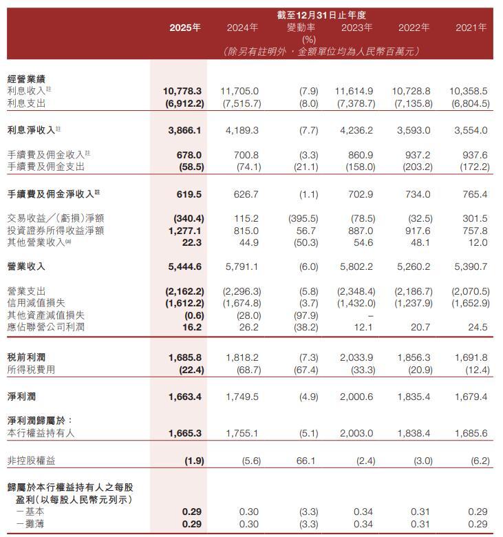 晋商银行(02558) 近日发布的2025年全年业绩公告显示,2025年该行实现营业收入54.45亿元,同比减少6.0%;净利润16.63亿元,同比减少4.9%;归属于银行股东的净利润16.65亿元,同比减少5.1%。