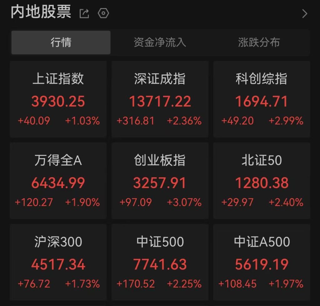首页 大数据中心 A股三大股指齐高开 超5000只个股上涨 A股三大股指齐高开 超5000只个股上涨 大数据中心 总编辑 · 2026年4月8日 18:02 · 31557 阅读 · 0 评论 中新网4月8日电 (记者 谢艺观)4月8日,A股开盘,上证指数高开1.03%,深证成指高开2.36%,创业板指高开3.07%。全市场超5000只个股上涨。盘面上,贵金属、互联网、电子元器件、半导体等行业板块涨幅居前;概念板块方面,航空运输精选、光模块(CPO)、光芯片等表现亮眼。 来源:中国新闻网 0 点赞 数据 图片转载于网络(如有侵权,请联系删除) 免责声明|内容转载于其他平台 不代表本平台观点立场 长期征集各类线索| 邮箱:wytglx@163.com