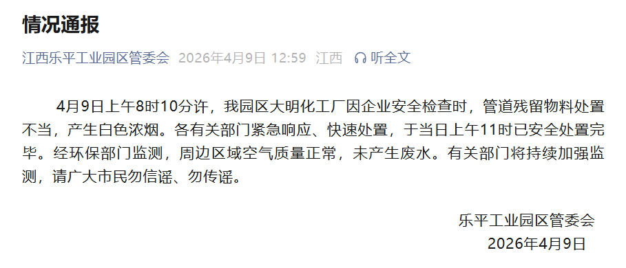 江西乐平工业园区通报一化工厂产生白色浓烟:已安全处置完毕