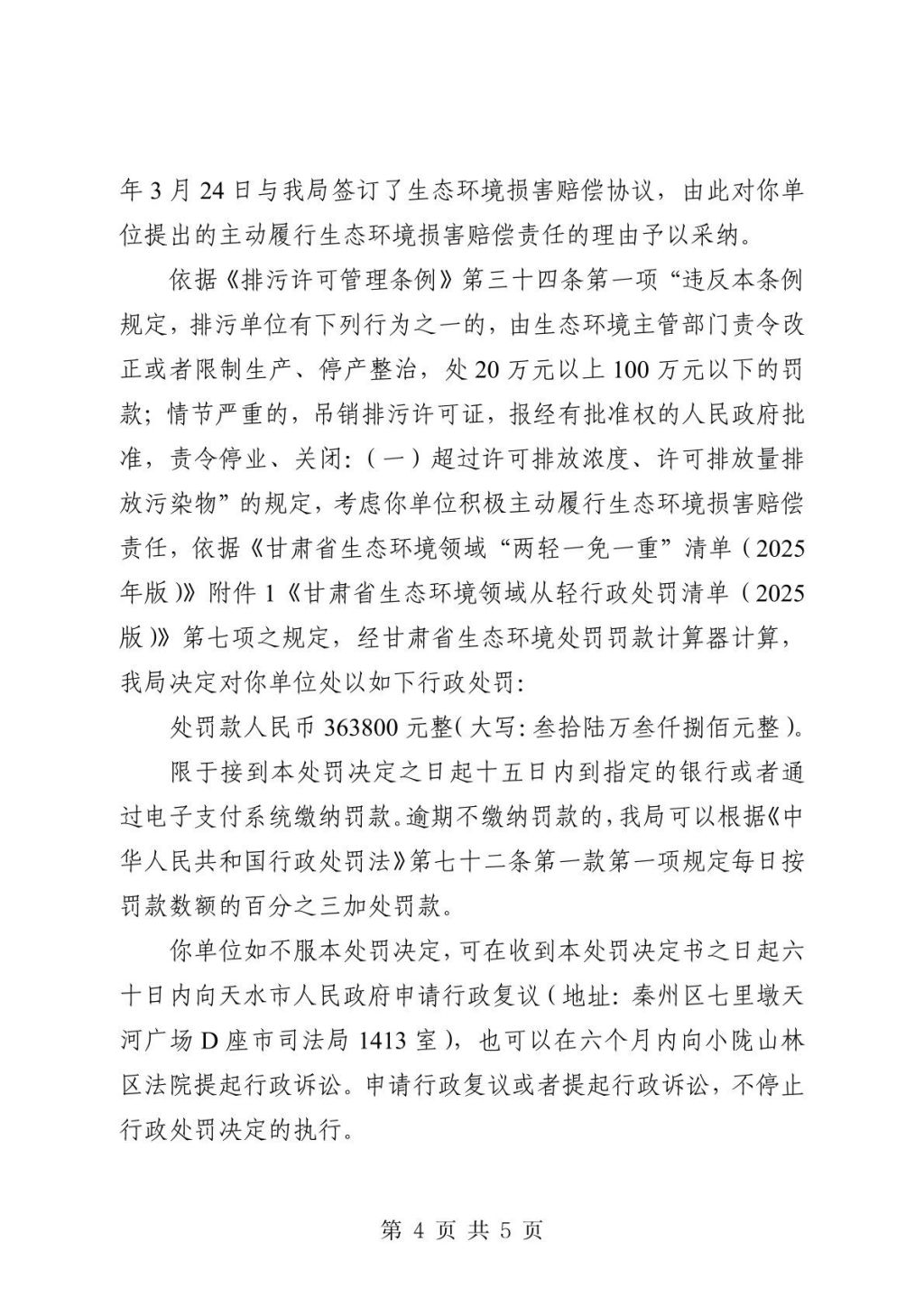 天水市生态环境局决定对甘谷县住房和城乡建设局处以罚款人民币363800元整。