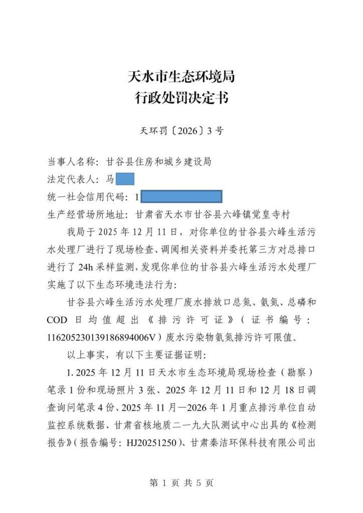天环罚〔2026〕3号行政处罚决定书显示,天水市生态环境局于2025年12月11日对甘谷县住房和城乡建设局的甘谷县六峰生活污水处理厂进行了现场检查、调阅相关资料并委托第三方对总排口进行了24h采样监测,发现甘谷县六峰生活污水处理厂废水排放口总氮、氨氮、总磷和COD日均值超出《排污许可证》污染物氨氮排污许可限值。