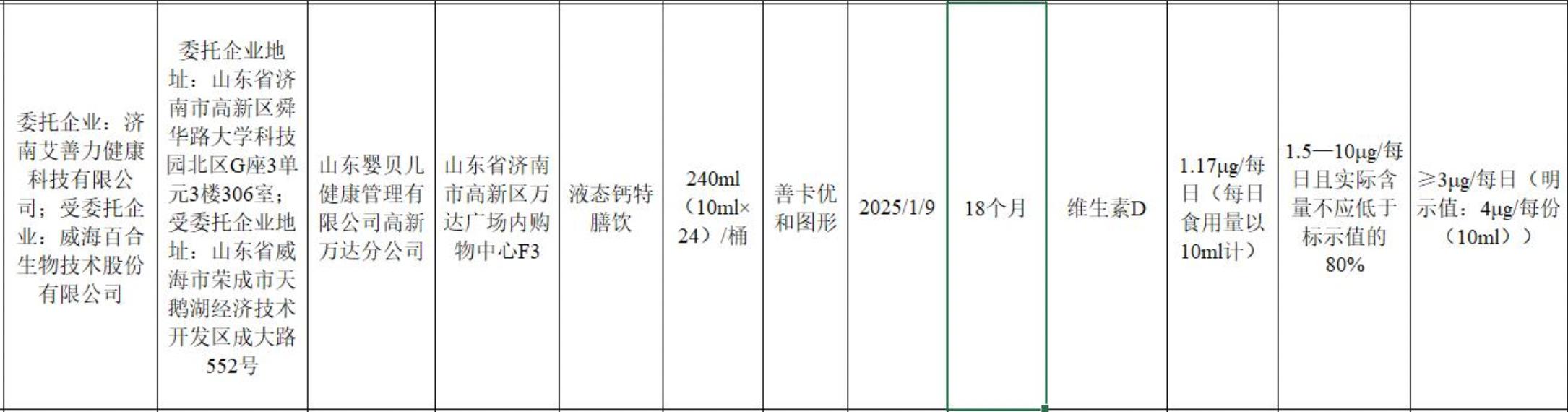 据通报,问题液态钙特膳饮产品委托企业为济南艾善力健康科技公司,受委托生产企业为百合股份,由山东婴贝儿健康管理公司高新万达分公司销售。该款产品规格为240ml(10ml×24)/桶,生产日期为2025年1月9日,保质期18个月,其中维生素D检验值为1.17ug/每日(每日食用量以10ml计),标准值为1.5一10ug/每日且实际含量不应低于标示值的80%,标签标注≥3ug/每日(明示值:4ug/每份(10ml))。