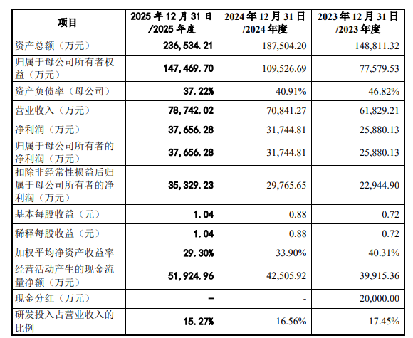 更新的招股书显示,2023年度、2024年度、2025年度,公司营业收入分别为61,829.21万元、70,841.27万元和78742.02万元,净利润分别为25880.13万元、31744.81万元和37656.28万元,扣除非经常性损益后归属于母公司所有者的净利润分别为22,944.90万元、29,765.65万元和35329.23万元。