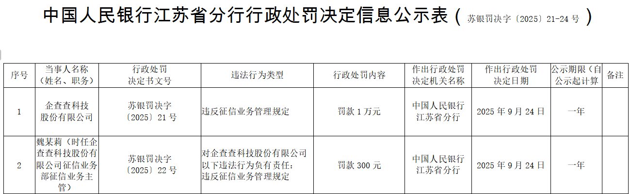 企查查的数据合规问题也持续受到监管关注。在招股书披露的前一天,中国人民银行江苏省分行于去年10月9日公布行政处罚决定信息公示表(苏银罚决字〔2025〕21-24号)。企查查科技股份有限公司因违反征信业务管理规定,被中国人民银行江苏省分行罚款1万元。魏某莉(时任企查查科技股份有限公司征信业务部征信业务主管)被罚款300元。
