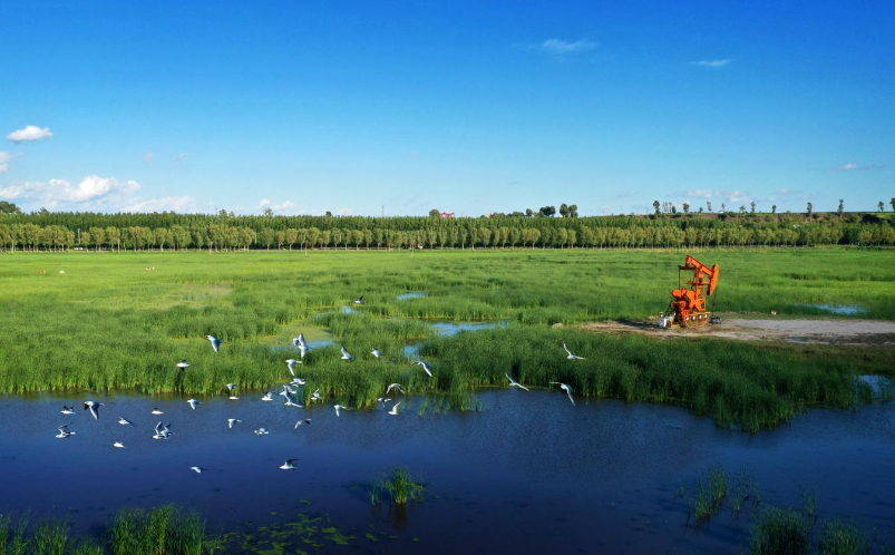 中国石油狠抓矿区生态保护修复,在大庆、长庆、新疆、塔里木、大港、华北油田建成9个自主贡献型生物多样性保护地,开展就地保护;吉林油田提前6年完成查干湖国家级自然保护区内油水井退出任务;大港油田将62万平方米盐碱荒滩变为湿地,吸引东方白鹳等10余种珍稀鸟类栖息。