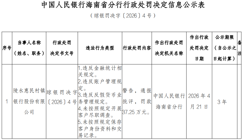 中国经济网北京4月25日讯 央行网站昨日公布的中国人民银行海南省分行网站行政处罚决定信息公示表(琼银罚决字〔2026〕4号)显示,陵水惠民村镇银行股份有限公司违反金融统计相关规定;违反账户管理规定;违反反假货币业务管理规定;未按照规定开展客户尽职调查;未按照规定保存客户身份资料和交易记录。中国人民银行海南省分行对其警告,通报批评,罚款37.25万元。