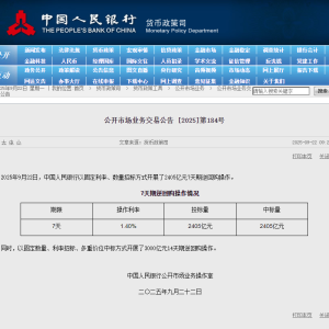 中国人民银行网站截图。 人民网北京9月22日电 (记者罗知之)据中国人民银行网站消息,中国人民银行今日以固定利率、数量招标方式开展了2405亿元7天期逆回购操作。同时,以固定数量、…